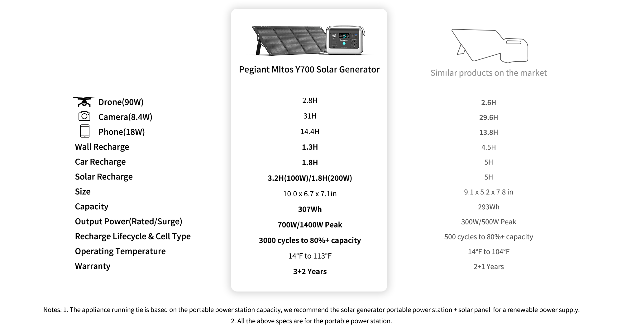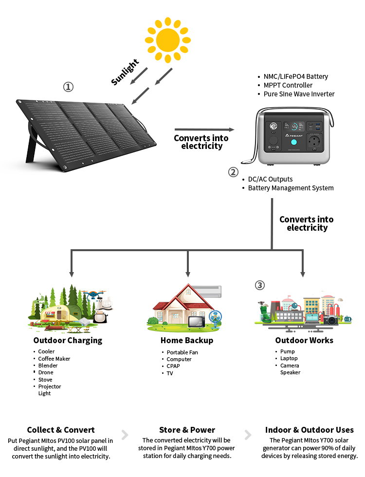 Pegiant's power stations fastly recharge with MItos solar panels, an AC outlet, or a car port for convenient power options.