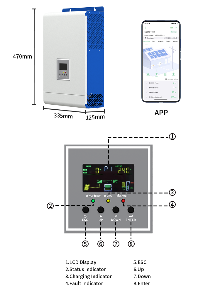 Elevate your power solution with our Multi-Function Inverter/Charger! This versatile device seamlessly combines the functions of an inverter, solar charger, and battery charger, delivering uninterrupted power support in a compact, portable power package. With its intuitive LCD interface, you have full control at your fingertips, easily configuring settings such as battery charging current, AC/solar charger priority, and input voltage for different applications.