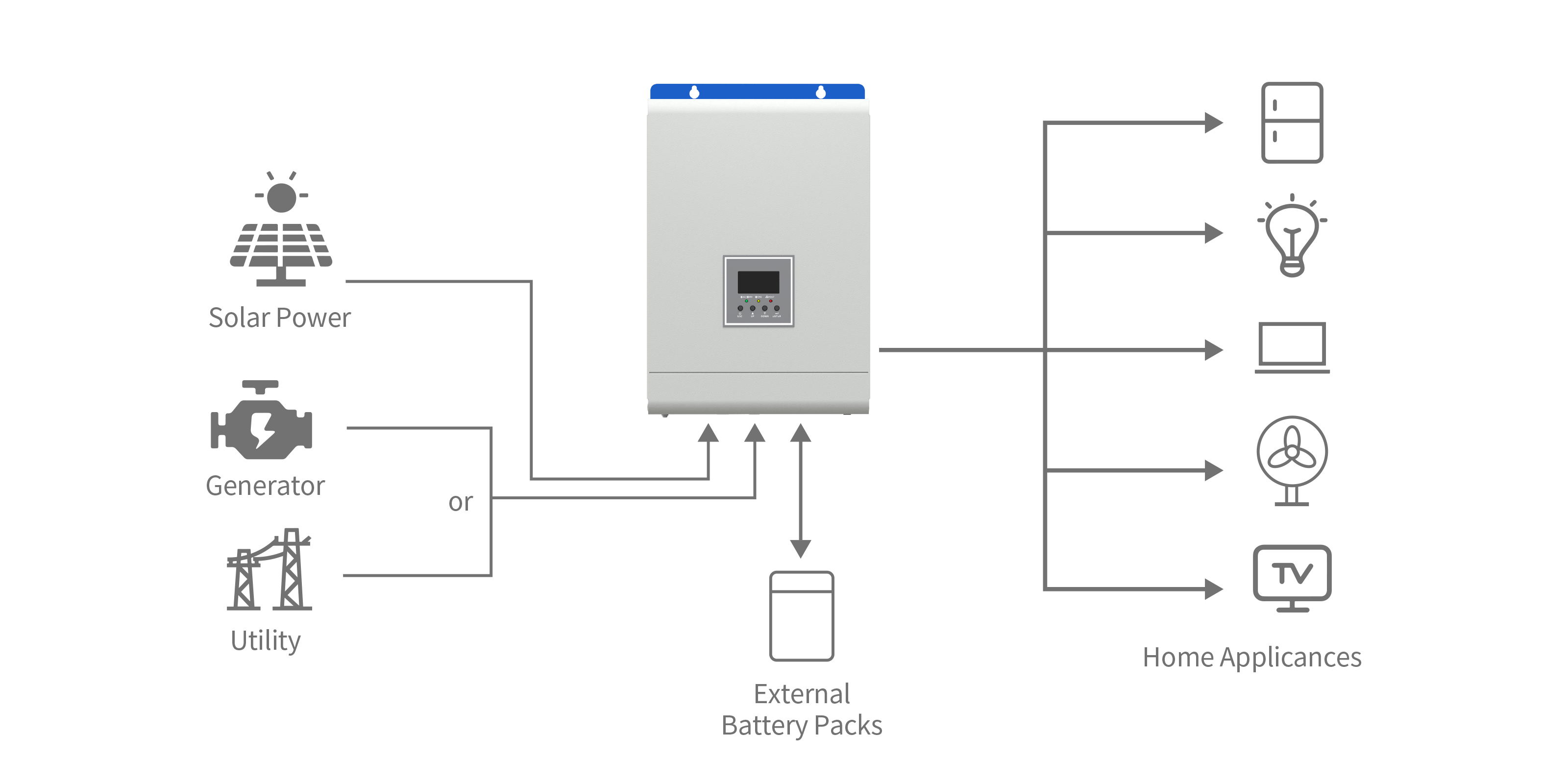 Designed to work seamlessly with generators, utility power, and PV modules, our Inverter/Charger can power all kinds of motor-type appliances in home or environment. Such as tube lights, fans, refrigerators, and air conditioners. Experience uninterrupted power wherever you are with our reliable and efficient solution!